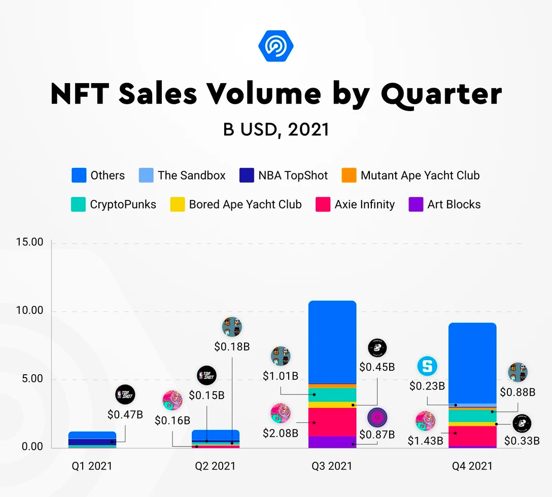 2021년은 NFT가 메인스트림의 주목을 받은 해라 해도 과언이 아닙니다. 2018년에 $41M에 불과하던 거래량은 2021년 상반기에 $2.5B를 찍으면서 3년 사이에 60배 가량 증가하였습니다.