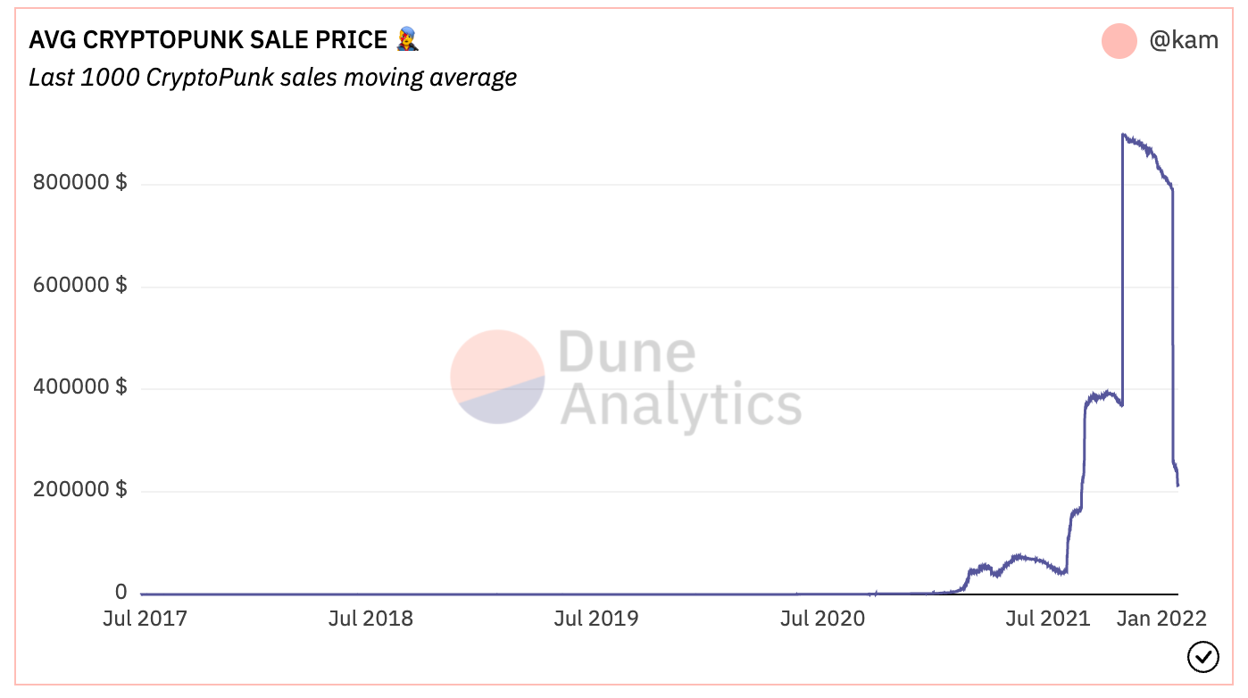 위에는 BAYC의 USD 가치 기준 평균 판매가이고, 아래는 크립토펑크의 USD 가치 기준 평균 판매가 차트입니다. BAYC는 크립토펑크의 평균가격을 2022년 1월 중순 경에 추월하기 시작합니다. 이는 사실 크립토펑크의 평균 판매가가 급격히 추락한 이유도 존재합니다.