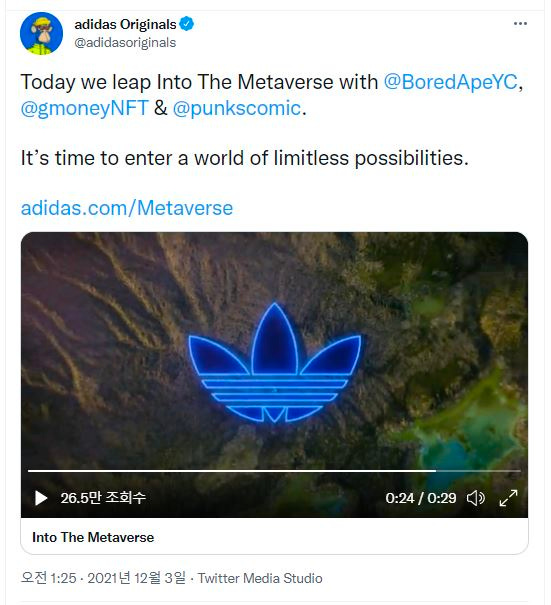 ‘we leap Into The Metaverse’ 프로젝트는 아디다스 로고가 박힌 NFT를 새롭게 발행하는 것으로, 아디다스 오리지널과 지머니, BAYC, 펑크스코믹이 참여하였습니다. 디지털 NFT를 사면 실물도 인도되는 프로젝트였습니다.