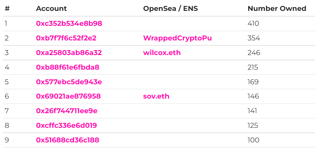 크립토펑크 홀더 수는 3,187명로 BAYC 홀더 수(5,997명)의 절반 가까이됩니다. 더군다나 상위 9위까지의 홀더가 100개 이상의 펑크를 보유함으로써, 펑크가 소수 홀더에 집중되어 있는 것을 알 수 있습니다. 이는 신규 구매자가 지속적으로 늘어나는 것을 저해하는 요인으로 작용될 것으로 보입니다.