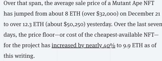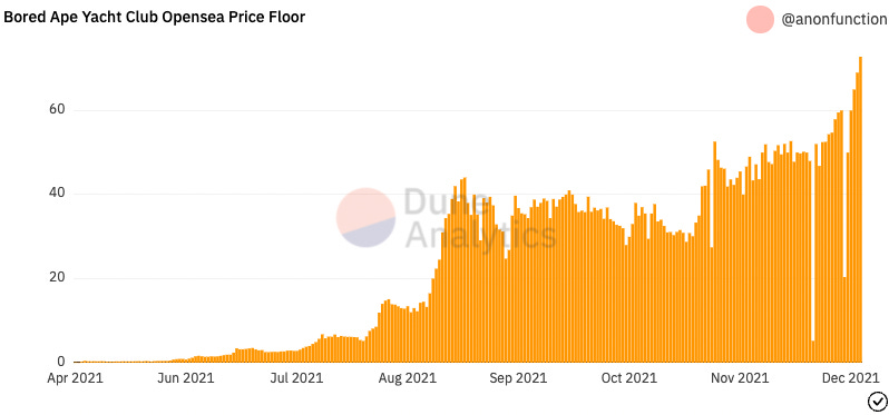 또한 21년 12월 가장 비싸게 팔린 Top 10 NFT 순위에서, 888 ETH에 팔렸던 Mega Mutant Serum을 꺾을 NFT는 존재하지 못했습니다. 크립토펑크는 3,4,6,9위 (약 8억원 ~ 약 13억원 가치) 를 차지하는 반면, BAYC는 1,7,8,10위 (약 8억원 ~ 약 40억원 가치) 를 차지하였습니다.