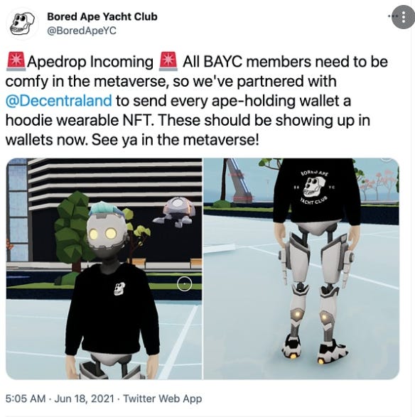 Decentraland : BAYC 멤버들은 디센트럴랜드에서 BAYC 홀더들에게 BAYC 마크가 그려진 후드티를 에어드랍 받는 걸 파트너십을 통해 얻어낼 수 있었습니다.