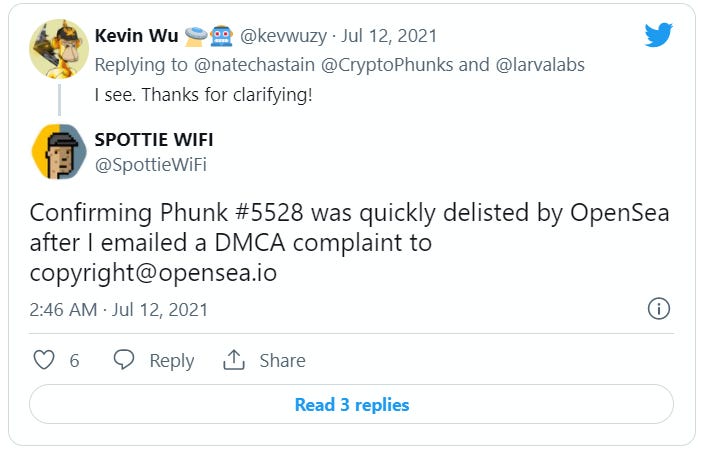 IP가 철저히 Larva Labs에 속해있다는 것을 알 수 있는 계기는 하나 더 있습니다. 한 크립토펑크 홀더가 오픈시에 유사 NFT 리스팅 철회를 요청하기 위해, 즉 디지털 밀레니엄 저작권법(DMCA takedown)을 행사하기 위해서는 Larva Labs를 거쳐야 한다는 것입니다.