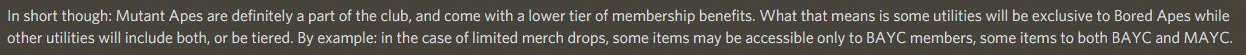 Yuga Labs는 MAYC는 BAYC 홀더가 갖는 권한을 대부분 보유하지만, 특정 고급 아이템 같은 것은 MAYC 홀더는 갖지 못하고 BAYC 홀더만 갖게 하겠다는 내부 방침이 존재해, BAYC의 Originality 가치를 보장하였습니다.