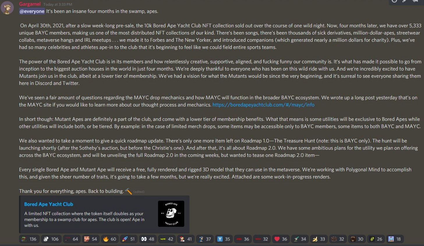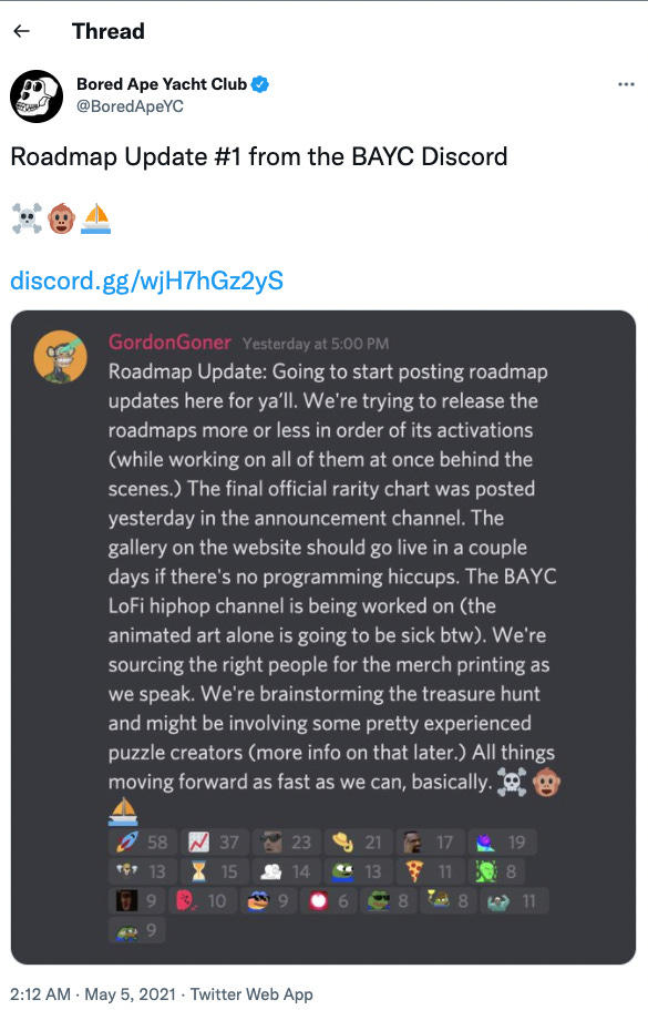 BAYC는 BAYC가 앞으로 무엇을 만들고자 하는 지, Next Plan이 있으면 줄곧 바로바로 디스코드, 트위터 등을 통해 커뮤니티와 공유하였습니다. 이를 통해 커뮤니티 멤버들은 앞으로 어떠한 세상이 펼쳐질 지 감을 잡을 수 있었고, BAYK, MAYC의 출현 뿐만 아니라, 모바일 게임, 메타버스 세계로의 파트너십 등 다양한 활동들이 BAYC에서 꾸준히 이뤄지겠다는 걸 알 수 있었습니다.
