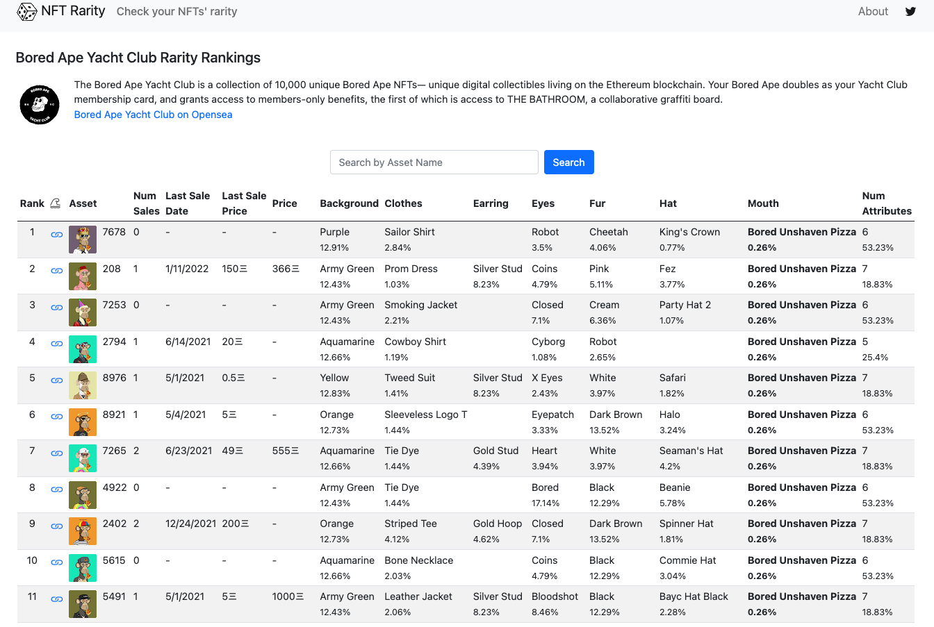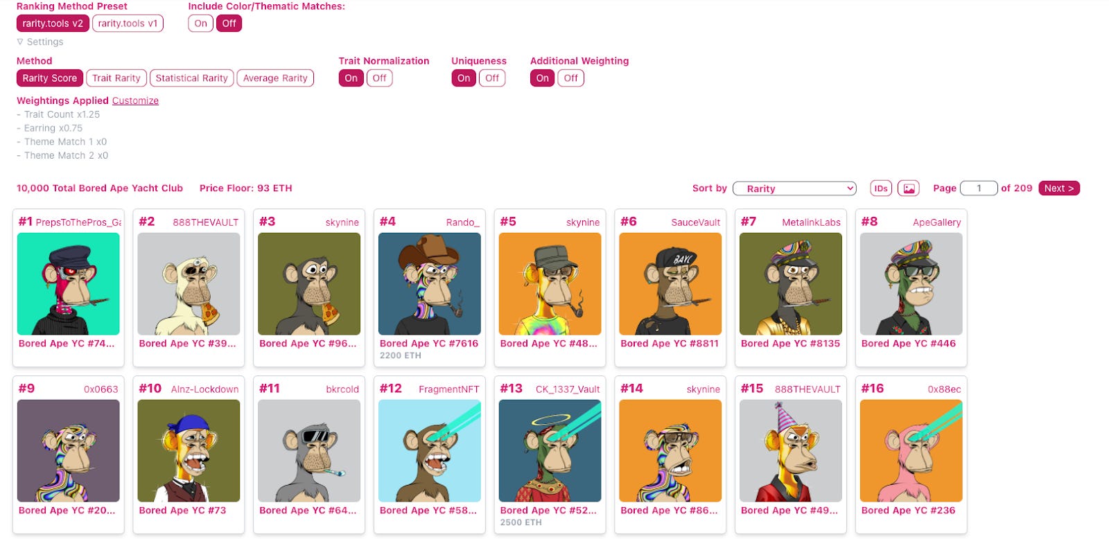 BAYC는 생성될 때 170개 특성이 프로그래밍 됐고, 이같은 특성들은 머리, 옷, 귀걸이, 눈, 털, 모자, 입 모양 등에 해당되며, 이같은 특성들의 Random한 조합으로 각각이 Unique한 10,000개의 BAYC NFT가 생성될 수 있었습니다. 위와 같은 특성들은 나올 수 있는 확률이 각각 달라, 어떠한 BAYC는 매우 희귀한 특성을 보유할 수 있고, 어떠한 BAYC는 그렇지 않을 수 있게 분류됨에 따라, Rarity에 따른 가치 편차도 발생할 수 있게 만들었습니다.