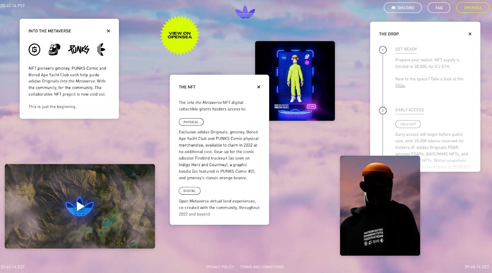 '메타버스 속으로' NFT 구매자는 또한 아디다스가 내년 출시를 목표로 구축 중인 개방형 메타버스 공간 내 가상 토지 NFT와 메타버스 내 커뮤니티 활동 참여 권리를 갖게 됩니다.