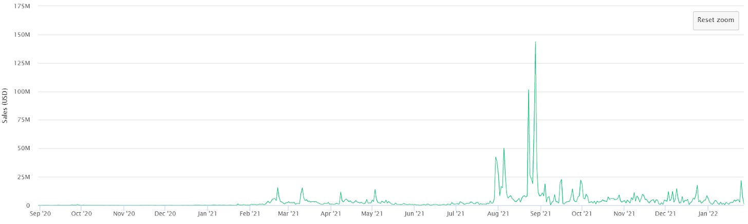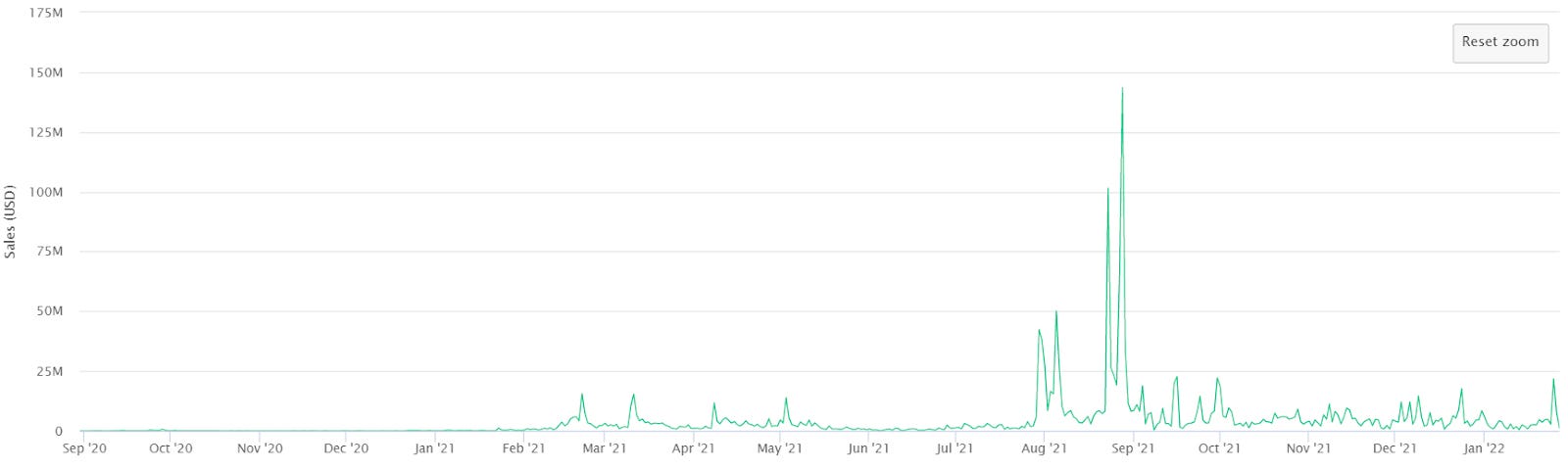 작년 4월 말에 처음 민팅돼, 올 해 1월까지 약 7~8개월 정도밖에 시간이 지나지 않은 BAYC 시리즈가 2017년에 발행돼 5년째 팔려오는 크립토펑크의 누적 거래액을 초월한 것은 5~6배 정도 같은 시간 대비 거래량이 더 컸다고 표현할 수 있겠습니다.