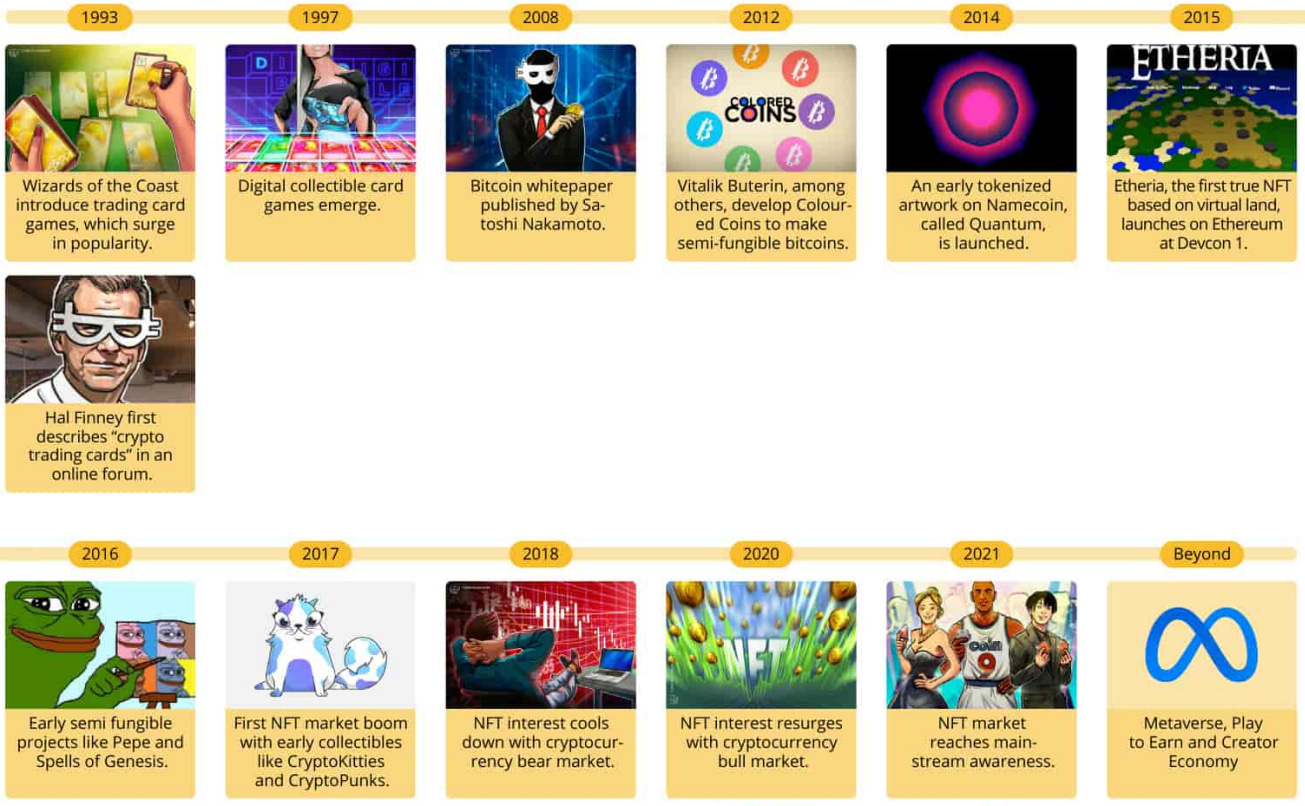 이더리움의 경우 2015년에 Etheria라는 최초의 NFT가 등장했습니다. 반면, NFT가 보다 대중에 알려지게된 결정적 계기는 2017년 크립토키티 사용자간 상호작용이 증가하여 이더리움 트래픽에 부하를 가져온 사건이라 볼 수 있습니다. 또한 2020-2021년에 NBA 탑샷 등 마니아 층을 겨냥한 NFT 프로젝트의 등장, 유명인사의 크립토 펑크와 같은 NFT 커뮤니티 합류 등으로 인해 NFT는 본격 메인스트림의 관심을 받게 되었습니다.