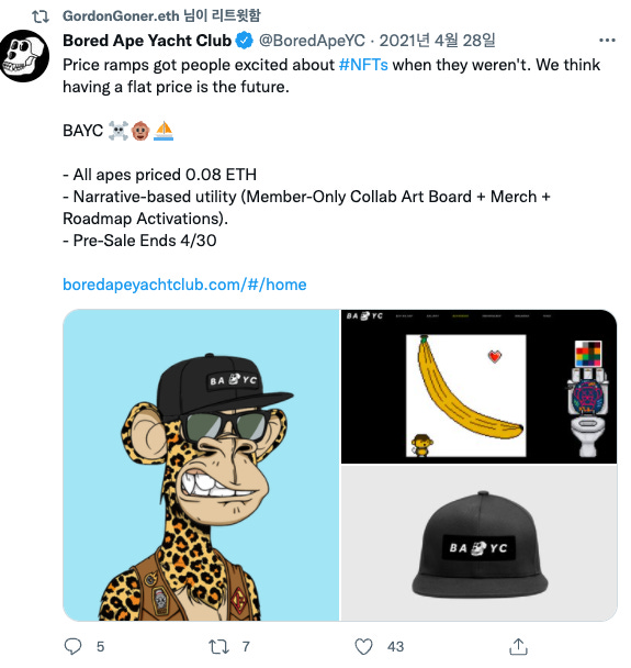 2021년 4월 28일에 올라온 트윗에는 BAYC를 한 장당 0.08 ETH (당시, 약 20만원 정도 가치)에 모두 팔겠다고 공지가 됐고, 이같이 모두가 공평한 똑같은 가격으로 파는 것으로 출발하는 것이 미래가 될 거라고 선언했습니다. 세일즈는 시작되자마자 2021년 4월 30일, 12시간 만에 끝났다고 합니다.