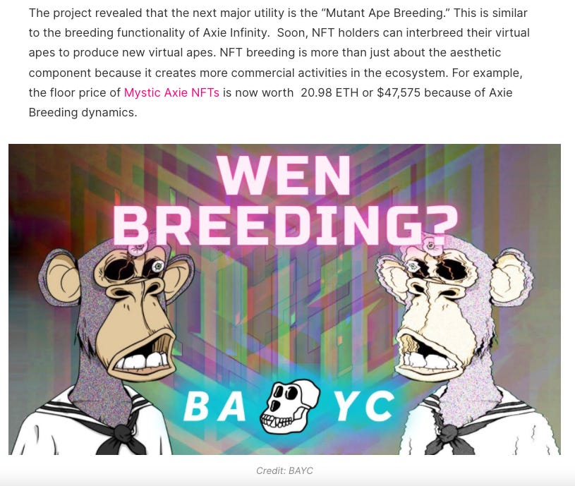 최근 BAYC는 브리딩 기능을 추가할 수 있다고 기대감을 선사하면서, 또다른 세계관이 형성될 수 있을지 많은 상상력을 갖고 커뮤니티 멤버들이 지켜보고 있습니다. (Mutant Ape Breeding)