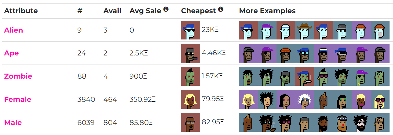 크립토펑크는 24x24 픽셀의 아바타로 총 5 종류(Alien, Ape, Zombie, Femail, Male)로 분류되며, 담배, 비니, 안경 등 장식이 최대 7개까지 장착되어 저마다 고유한 특징을 갖습니다. 크립토펑크는 총 1만개만 생성되어 그 자체로도 희소하지만, 그 중에서도 희소한 특징을 가진 아바타일수록 보다 비싸게 거래됩니다.