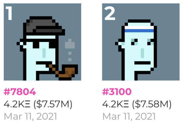 크립토펑크는 전체 NFT 판매 기록 중 가장 높게 거래된 NFT 2, 3위(현재는 순위가 변동됨) 모두 차지할 정도로 그 가치는 매우 높게 인정받고 있습니다(1위는 비플의 <EVERYDAYS: THE FIRST 5000 DAYS>로 이는 $69B (약 820억원)에 낙찰되었습니다).