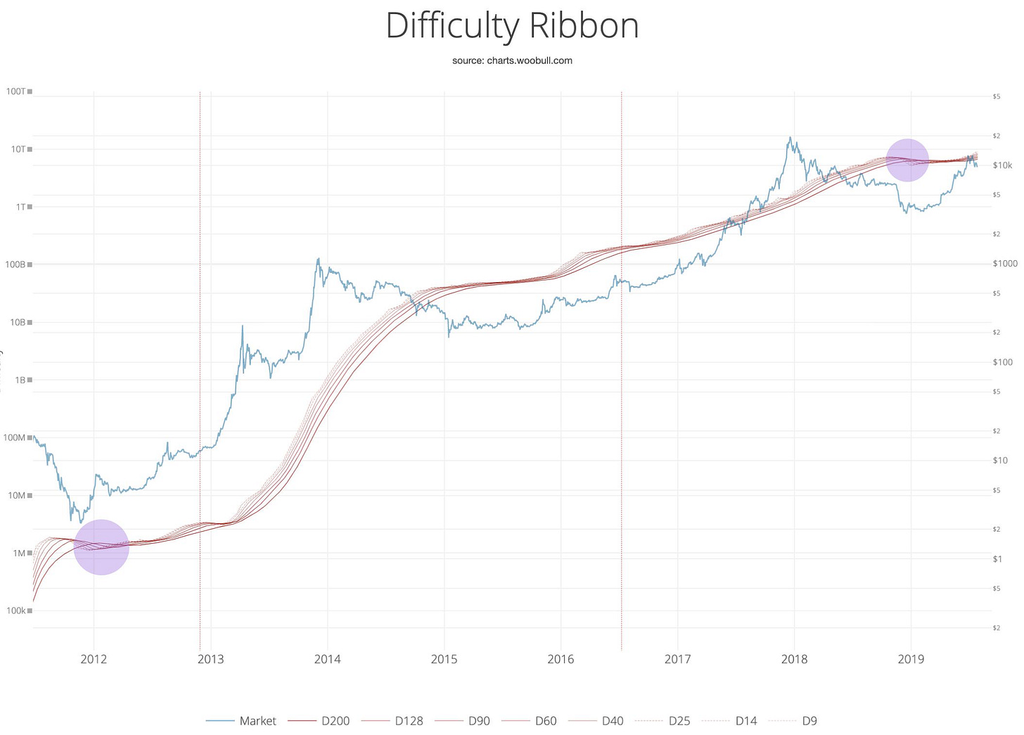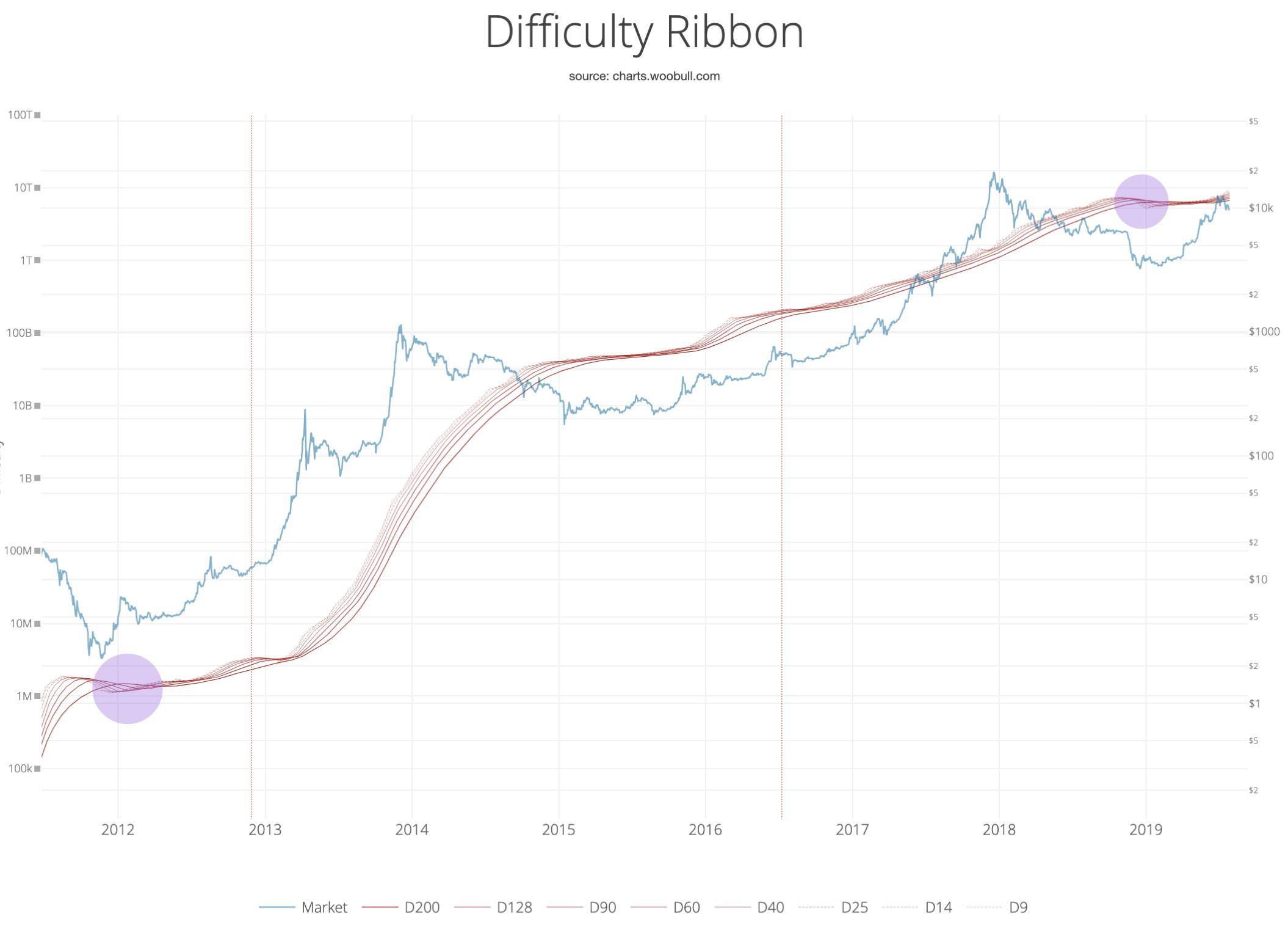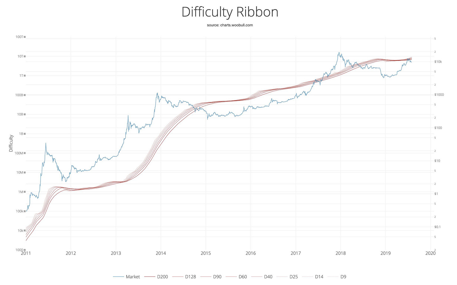 즉, 시간이 지나면서 채굴 경쟁이 심화되거나 반감기로 인해 발생하는 채굴자의 마진 감소는, 이들의 수익성이 줄게 만들면서 특정 시점에서 채굴을 중단하는 채굴자들이 발생하게 된다.Willy Woo의 Difficulty Ribbon에서 드러나는 채굴자의 행태