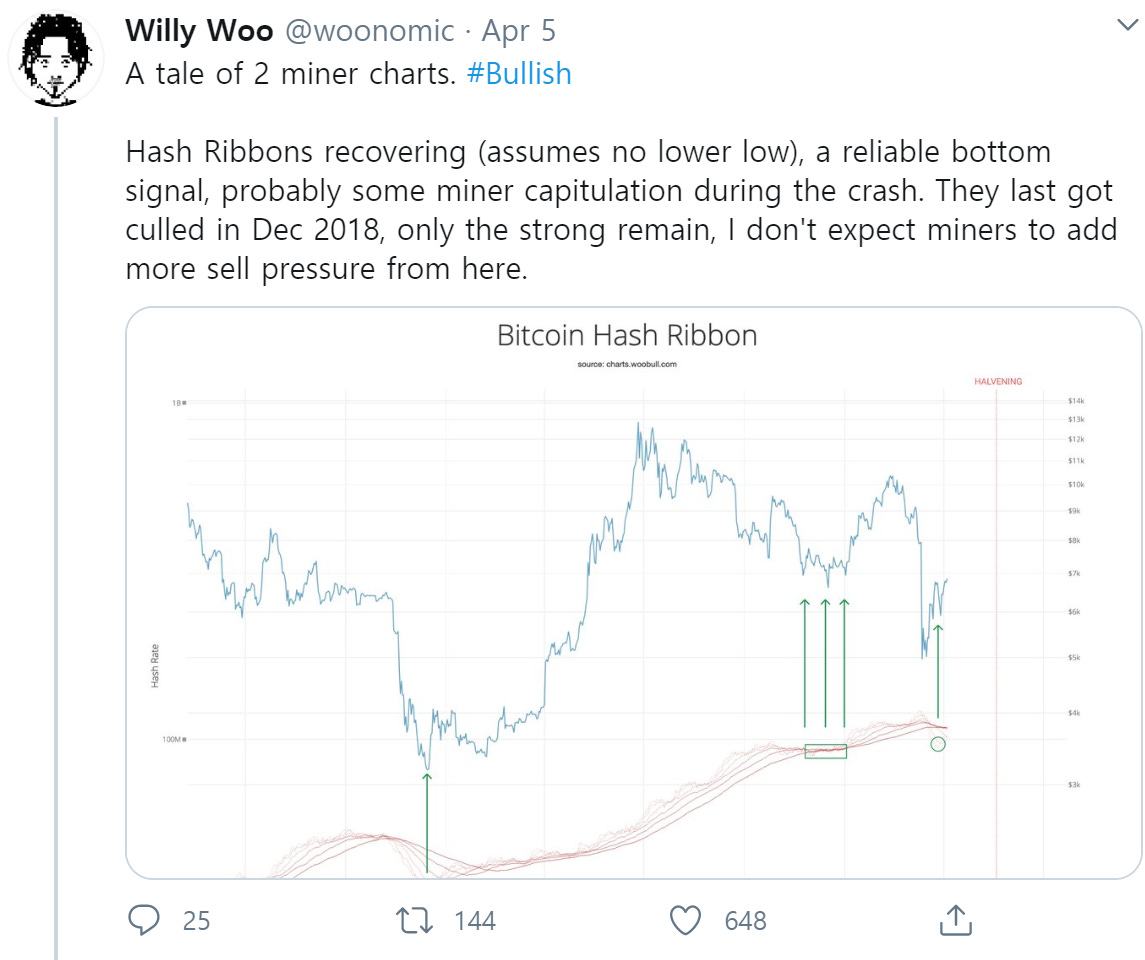 그러면, 다시 최근 2주 전에 Willy Woo가 트위터에 올린 글로 돌아가 보자.