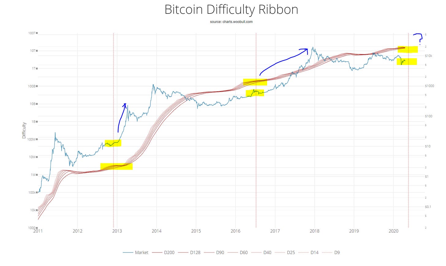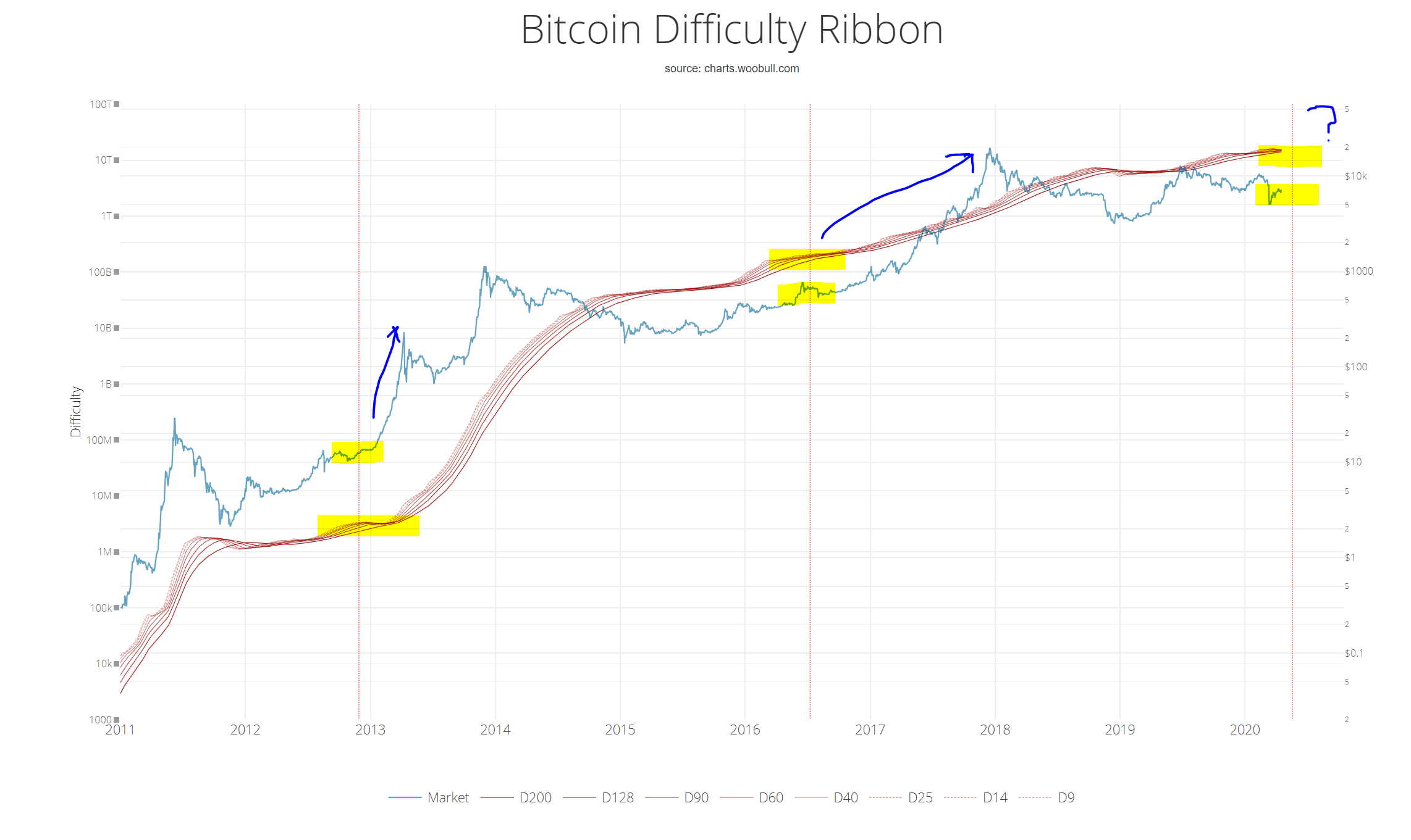 과거 반감기 시점 별로 Difficulty Ribbon이 어떻게 형성됐는 지는 하기 노랑색으로 마크한 표시 구간을 참조하면 된다.