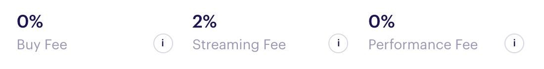 Streaming Fee: 마켓 캡에 비례하여 1년 동안 SET 제작자가 언제든지 가져갈 수 있는 비율을 뜻한다. 예를 들어, 세트를 만든 후 6개월 후 $1M 마켓캡에 2% Streaming Fee가 있다면, 1년 중 절반에 해당하는 $10K를 가져갈 수 있다.