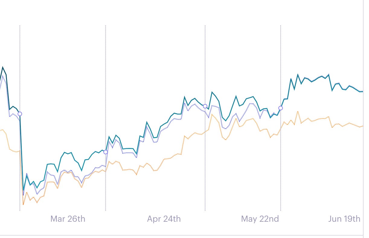 SET 페이지에 들어가면, 언제 Rebalancing이 일어났었는지 기록이 되어 있고, 각 자산을 직접 소유하는 것과, SET으로 소유할 때의 차이를 보여준다. 다음은 ETC/BTC RSI Ration Trading SET의 화면으로, 점선으로 표시된 시점이 Rebalancing이 일어난 시점이며, 첫 구간에는 WBTC, 두번째에는 WETH, 세번째에는 WBTC, 네번 째에는 WETH 를 소유했으며, WBTC (노란 점선)나 WETH (파란 점선)을 계속 소유했을 때보다 대체적으로 높은 수익률을 기록하고 있음을 보여준다.