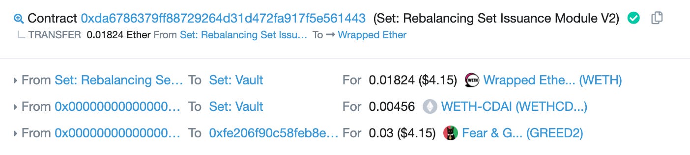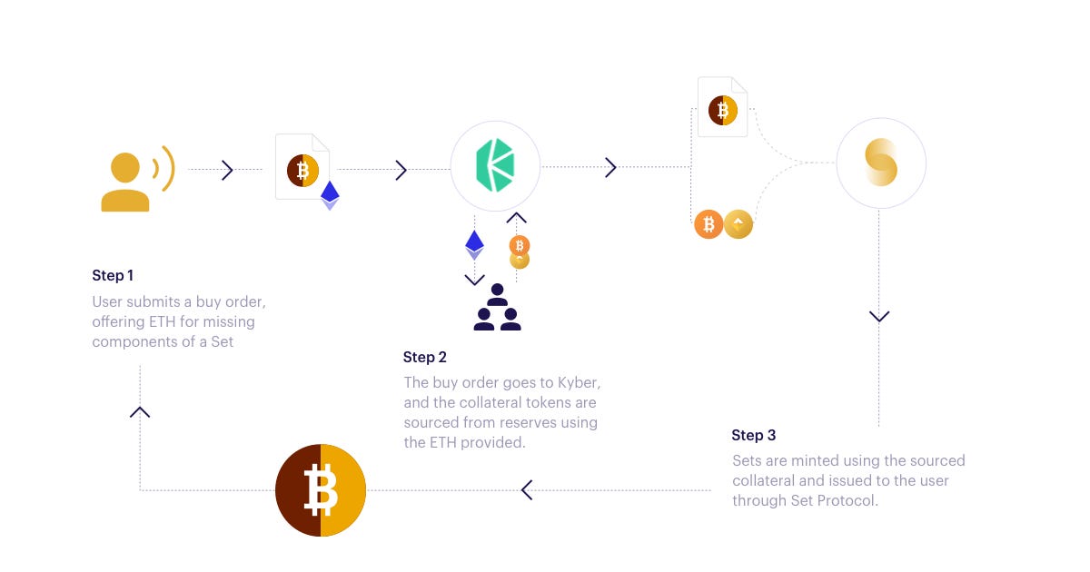 SET 구매시 매력적인 점은, Kyber Swap을 사용해서 자산 배분이 컨트랙트 상에서 자동으로 이루어진다는 것이다. 아래 그림에서 처럼, 유저는 ETH, DAI와 같은 가지고 있는 자산으로 세트를 구매하면, 세트를 구성하고 있는 WETH, WBTC 등이 컨트랙트를 통해 블록체인 상에서 구매 되어 Vault 컨트랙트에 예치되면서 거래가 완성된다.