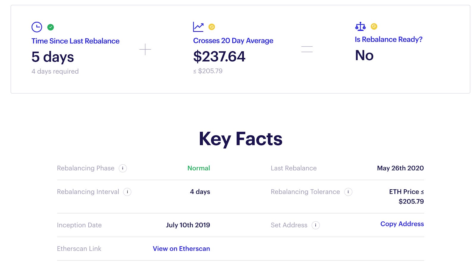 다음 그림에서는 eth20smaco (https://www.tokensets.com/set/eth20smaco) 세트의 리밸런싱 규칙을 예시로 보여주고 있다. 20 Day Average를 통과하면 리밸런싱이 일어나도록 설정되어 있고, 현재 $237.64 가 $205.79 보다 작지 않기 때문에 리밸런싱이 필요한 상태가 아니다.