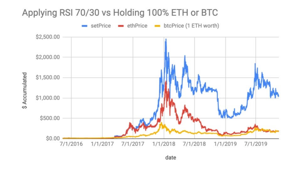 다음은 2016년 7월 부터 RSI를 사용해서 이더리움과 비트코인을 구매하였을 때 그래프이다. RSI 70 이상이면 BTC로 변환, 30이하이면 ETH로 변환을 반복했을 때, 이더리움 급락 구간 2018년 1월 ~ 7월에 수익을 잘 보존한 것을 볼 수 있다.