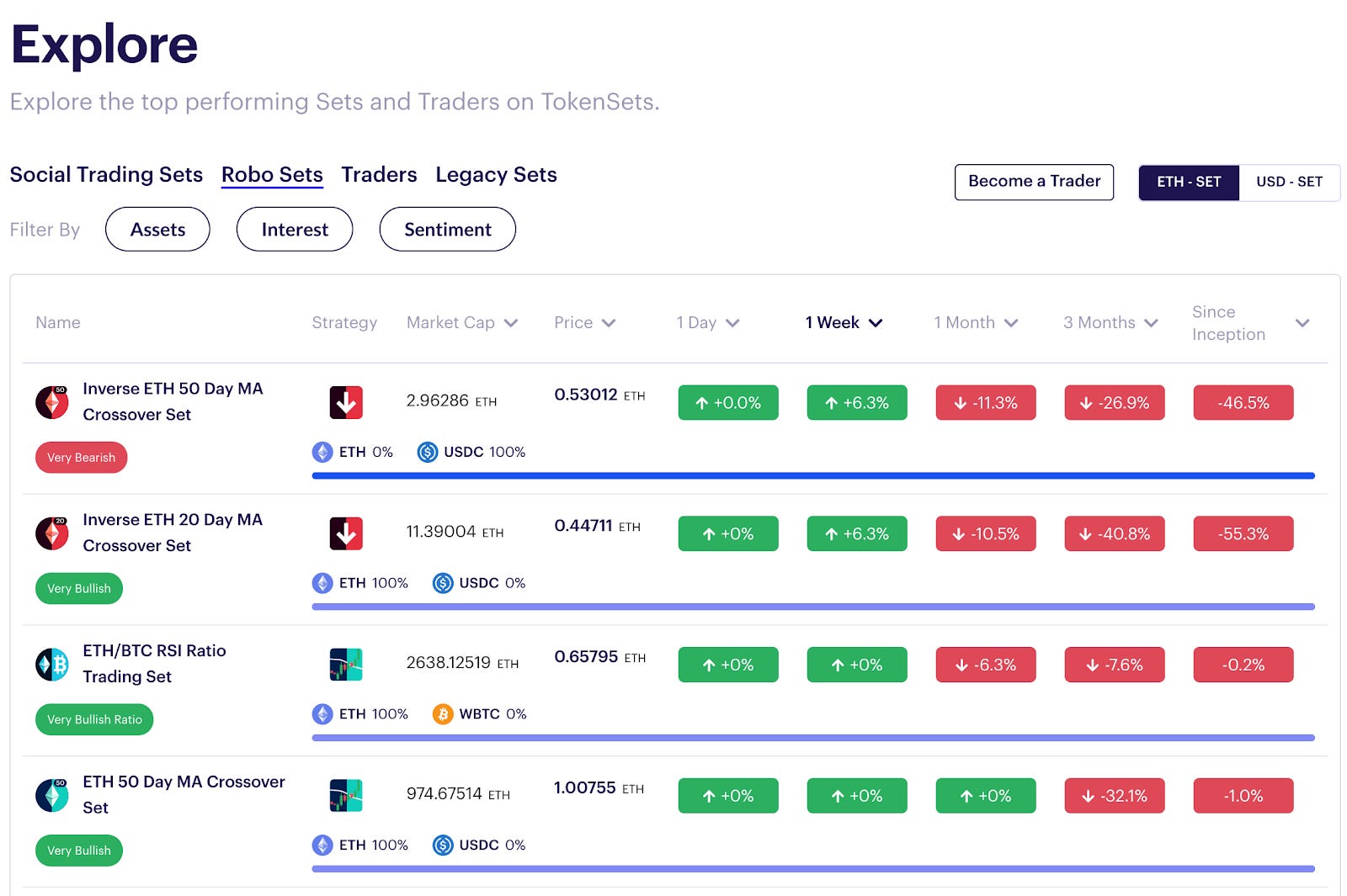 explore 페이지 (https://www.tokensets.com/explore) 를 방문하면 현재 어떤 세트가 운영중이고, 수익률이 어떠한지 알 수 있다. 다음 화면은 6월 18일 기준, Robo Sets 화면이다. Robo Sets와 Social Trading Sets의 차이는 Rebalancing 룰의 존재 여부에 달려있다.